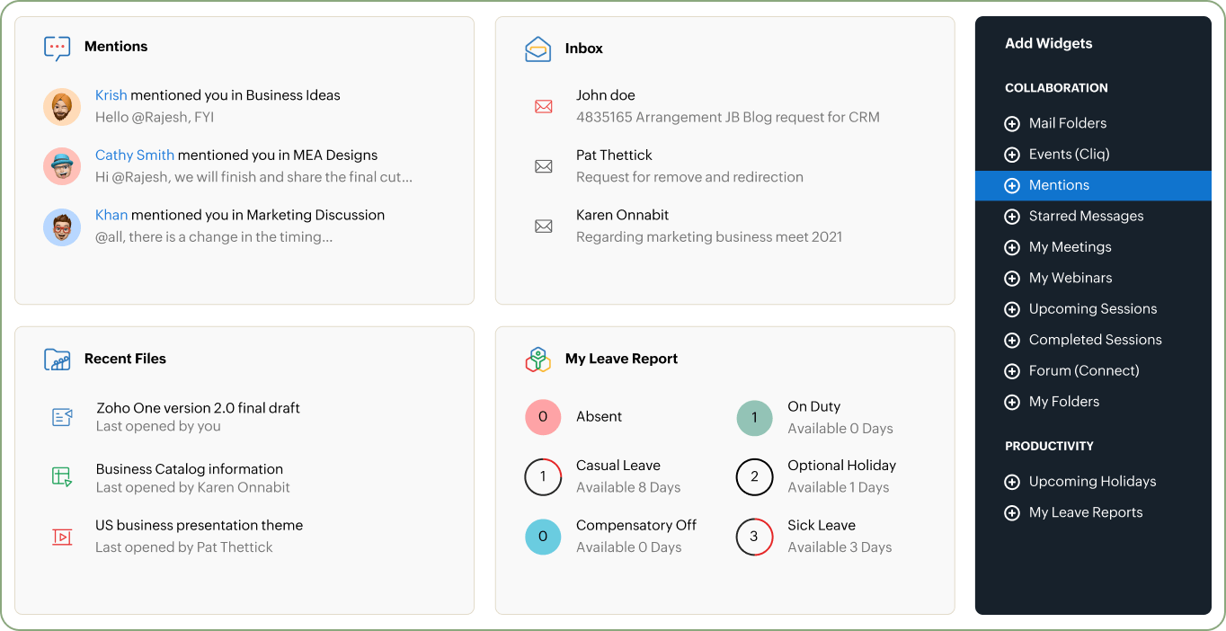 Zoho One cung cấp những ứng dụng giá trị nhất cho từng bộ phận nòng cốt trong tổ chức của bạn.